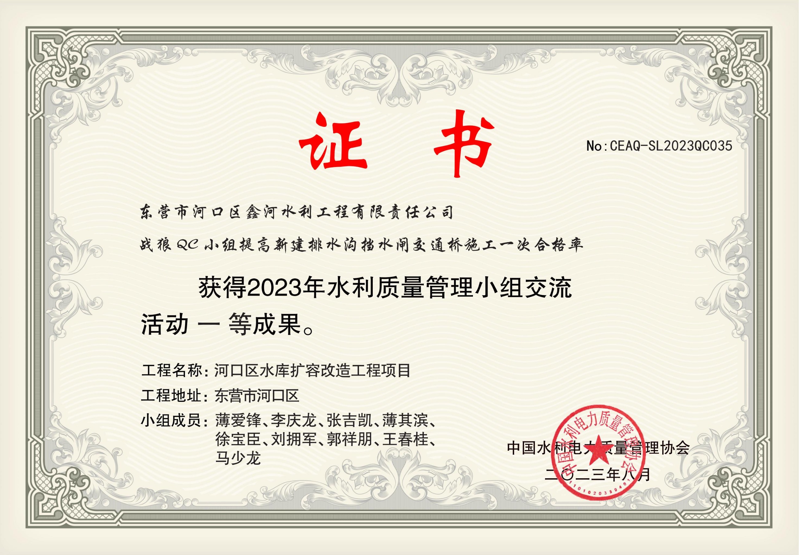 2023年課題:提高新建排水溝擋水閘交通橋施工一次合格率(中國(guó)水利電力質(zhì)量管理協(xié)會(huì)一等成果證書)